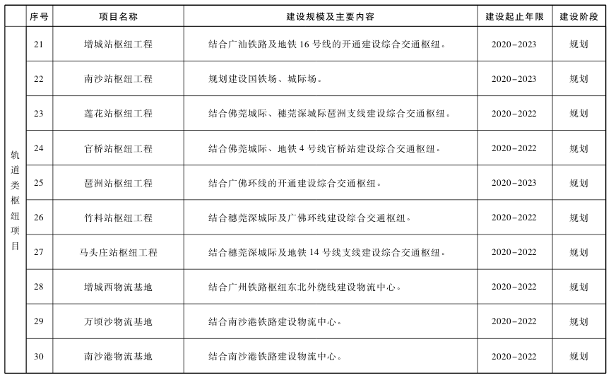 2020年基本建成國際性綜合交通樞紐。著力解決廣州白云國際機(jī)場(chǎng)的空域問題,加快航空樞紐基礎(chǔ)設(shè)施和集疏運(yùn)系統(tǒng)建設(shè),拓展歐美非國際航線,完善航線網(wǎng)絡(luò),建成國家面向亞太地區(qū)的航空門戶樞紐;優(yōu)化完善廣州港,積極推動(dòng)郵輪母港建設(shè),建成南沙港鐵路,實(shí)現(xiàn)海鐵聯(lián)運(yùn),建設(shè)廣州國際航運(yùn)中心;建設(shè)高鐵東西向通道和鐵路主樞紐站場(chǎng),開通國際鐵路班列,基本實(shí)現(xiàn)距廣州1000公里范圍主要城市3小時(shí)內(nèi)直接通達(dá);基本建成以廣州為核心的粵港澳大灣區(qū)城際鐵路網(wǎng)和城際鐵路樞紐體系,實(shí)現(xiàn)1小時(shí)交通圈;完善珠江口高速公路網(wǎng),強(qiáng)化對(duì)粵港澳大灣區(qū)城市群的輻射力。
