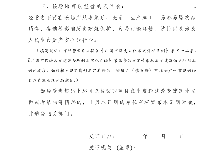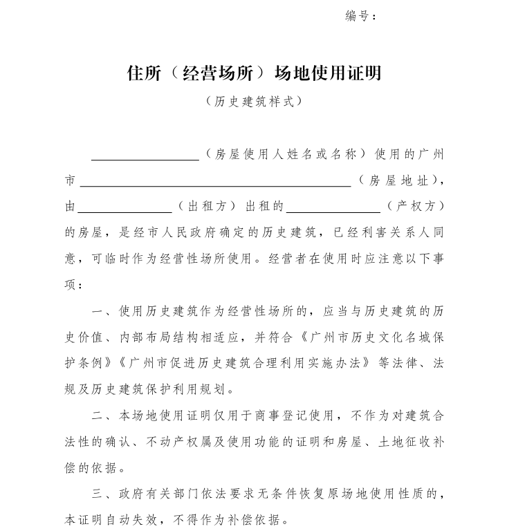 第二十六條 保護責任人按照《廣州市歷史文化名城保護條例》及本辦法相關要求,利用歷史建筑從事經營活動辦理商事登記,涉及改變房屋使用用途、未取得不動產登記證明的,所在地街道辦事處(鎮人民政府)應當向申請人出具場地使用證明(附件3)。