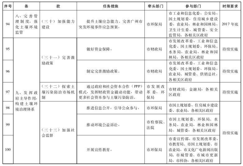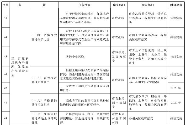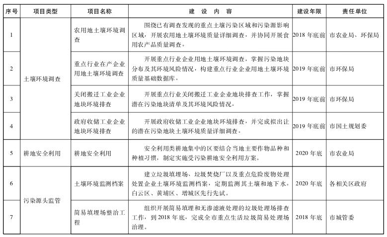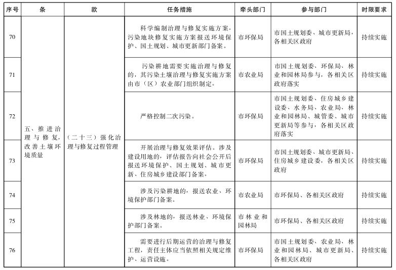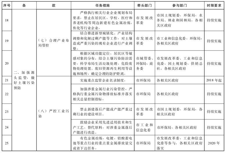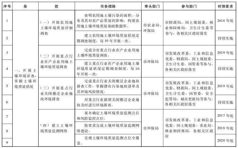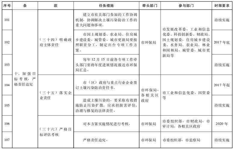 (二十五)統(tǒng)籌推進(jìn)工作落實(shí)。各區(qū)要于2017年6月底前制定并公布土壤污染防治工作方案,確定工作目標(biāo)、重點(diǎn)任務(wù)和工程項(xiàng)目,并逐一落實(shí)到部門(mén)、街道和重點(diǎn)行業(yè)企業(yè),工作方案報(bào)市政府備案。每年12月15日前各區(qū)政府應(yīng)將年度土壤環(huán)境保護(hù)重點(diǎn)工作進(jìn)展情況及下年度工作計(jì)劃報(bào)送市環(huán)保局。