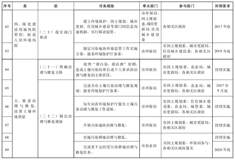 2017年底前,建立環(huán)境保護(hù)、國(guó)土規(guī)劃、城市更新、住房城鄉(xiāng)建設(shè)等部門(mén)間信息溝通機(jī)制,實(shí)行聯(lián)動(dòng)監(jiān)管(市環(huán)保局、國(guó)土規(guī)劃委、城市更新局、住房城鄉(xiāng)建設(shè)委牽頭,各相關(guān)區(qū)政府參與)。2018年底前,制定污染地塊環(huán)境監(jiān)管工作實(shí)施方案,報(bào)省環(huán)境保護(hù)廳備案(市環(huán)保局牽頭,市國(guó)土規(guī)劃委、城市更新局、住房城鄉(xiāng)建設(shè)委、各相關(guān)區(qū)政府參與)。