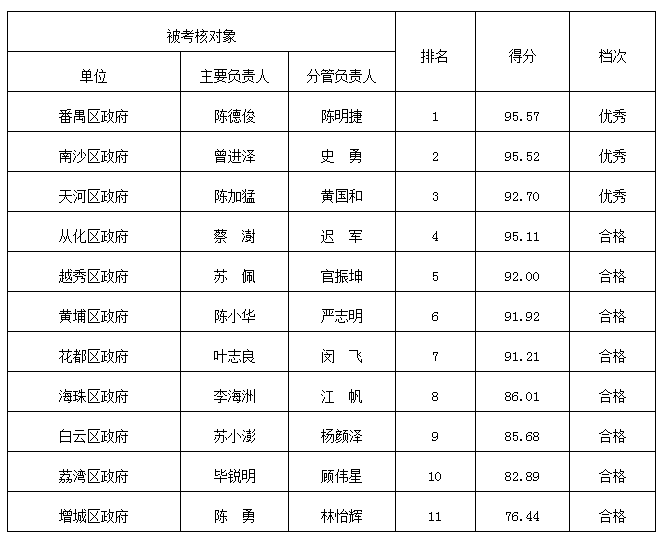 合格單位(8個):按得分高低排名依次是從化區、越秀區、黃埔區、花都區、海珠區、白云區、荔灣區、增城區政府。