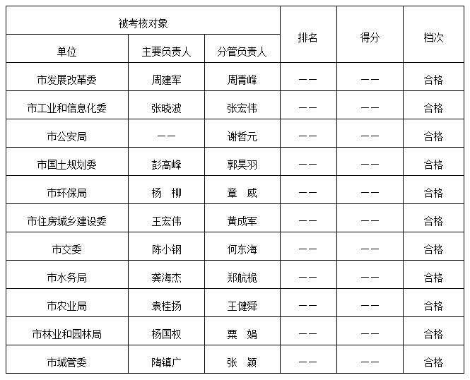 被考核的市發展改革委、工業和信息化委、公安局、國土規劃委、環保局、住房城鄉建設委、交委、水務局、農業局、林業和園林局、城管委考核結果均為合格。