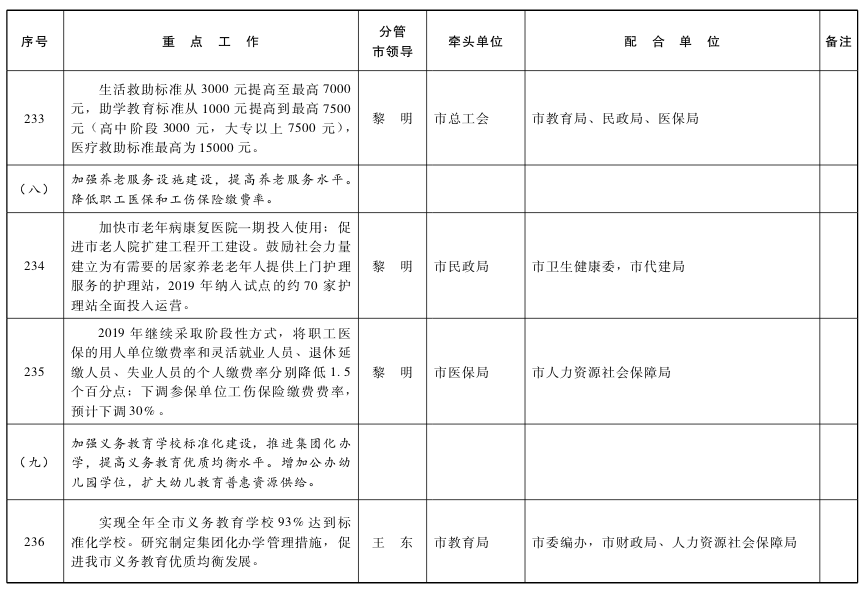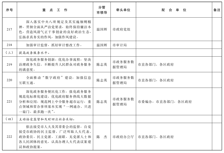 各區(qū)人民政府,市政府各部門、各直屬機構(gòu):《2019年市政府工作報告部署工作責(zé)任分工》已經(jīng)市政府第15屆68次常務(wù)會議審議通過,現(xiàn)印發(fā)給你們。全市各級各部門要按照工作分工,切實落實責(zé)任,抓緊制訂實施方案,細(xì)化任務(wù)目標(biāo)、工作措施、完成時限和各層級責(zé)任人,以釘釘子精神狠抓工作落實,確保按時高質(zhì)高效完成2019年市政府工作報告部署工作各項任務(wù)。