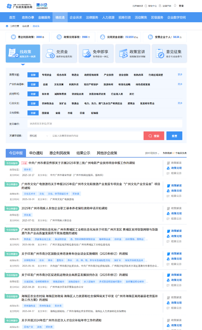作為廣州市統一的企業服務總門戶,“穗@i企”平臺政策“源頭”為廣州市政策文件庫,通過統一標準接口獲取最權威的政策版本后,平臺用大數據算法給企業“畫像”,再和政策標簽智能匹配。據統計,平臺整合了3000多件惠企政策、3500多份解讀文件、2000多項兌現事項。截至目前,已為225萬家企業精準推送了4721多萬次政策提醒,30多萬家經營主體通過它拿到了10多億元補貼,真正實現“政策找企業”“補貼一鍵達”。