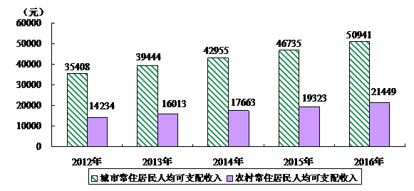 圖4 :2012-2016年廣州城市和農村常住居民人均可支配收入