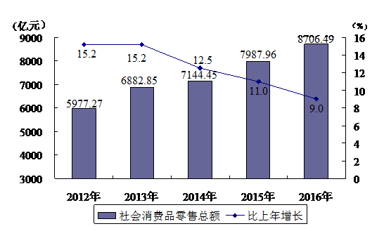 圖3 :2012-2016年廣州市社會消費品零售總額及其增長速度