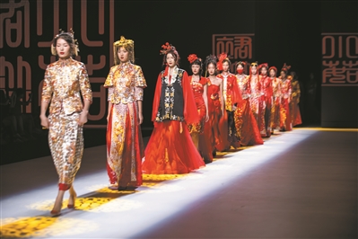 在白云國際會議中心,秀臺上的模特展示符合現代審美的創新裙褂。(資料圖)