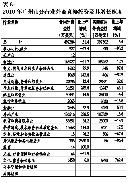 實際利用外資實現增長。全年實際使用外商直接投資金額39.79億美元,增長5.4%;批準外商直接投資項目(企業)980個,增長16.1%;合同外商直接投資金額49.74億美元,增長31.4%。全年批準投資總額在1000萬美元以上的外商投資項目163個,合同外資金額41.27億美元,增長9.8%。2010年,廣州市吸收來自58個國家和地區的外商直接投資項目980個。截至2010年底,世界500強大企業累計已有174家進入廣州,共設立411個項目,投資總額178億美元。