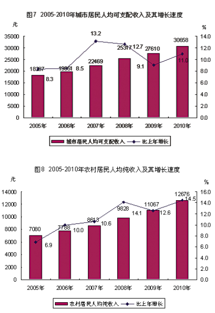 城鄉居民收入水平不斷提高。據城鄉居民家庭抽樣調查,全年城市居民家庭人均可支配收入30658元,增長11.0%,扣除價格因素,實際增長7.6%。農村居民家庭收入大幅增長,連續五年保持兩位數增長,全年農村居民家庭人均純收入12676元,增長14.5%,扣除價格因素,實際增長11%。