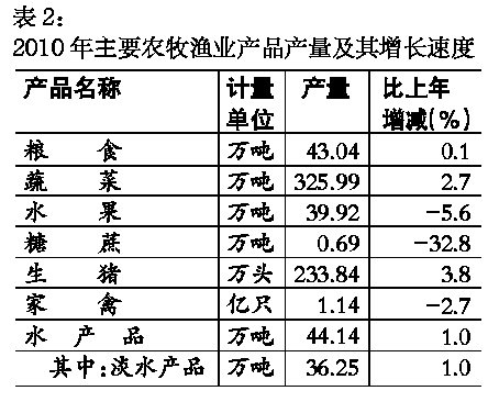 農業生產穩定發展。全年完成農林牧漁業總產值323.4億元,增長3.5%。其中,農業、林業、牧業、漁業及農林牧漁服務業完成產值分別為164.6億元、2.1億元、62.5億元、62.1億元和32.1億元。農業商品產值292.3億元,增長3.8%。農產品產銷率為90.3%。