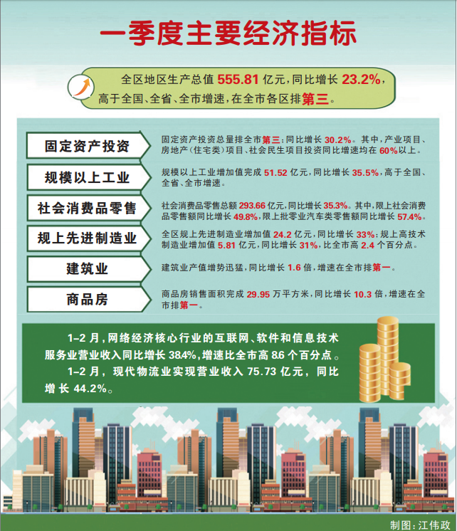 一季度,全區(qū)固定資產投資總量排全市第三;同比增長30.2%,增速比1-2月提高19.9個百分點;比2019年一季度增長30.5%,兩年平均增長14.2%。其中,產業(yè)項目、房地產(住宅類)項目、社會民生項目投資同比增速均在60%以上。
