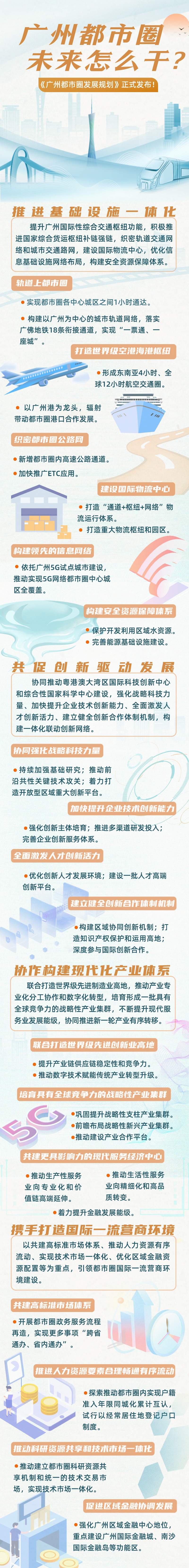 空港海港、公路網、物流樞紐等方面,提出形成東南亞4小時、全球12小時航空交通圈,提升都市圈航線網絡對全球主要國家和城市的覆蓋率;以廣州港為龍頭,輻射帶動都市圈港口合作發展;加快推廣ETC應用,提升都市圈內高速公路通勤效率,加快推進都市圈內票制資費統一標準;支持佛山在廣佛交界規劃建設“高標倉+智能化”現代物流產業園,全力打造大灣區到東盟國際班列。