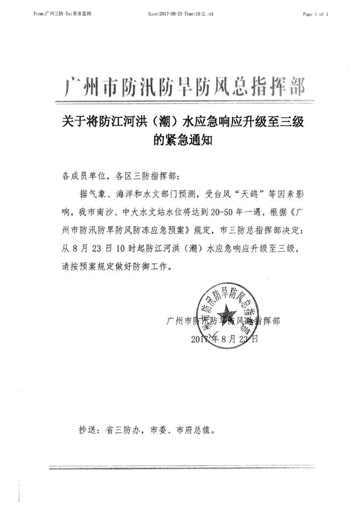 轉發關于將防江河洪(潮)水應急響應升級至三級的緊急通知