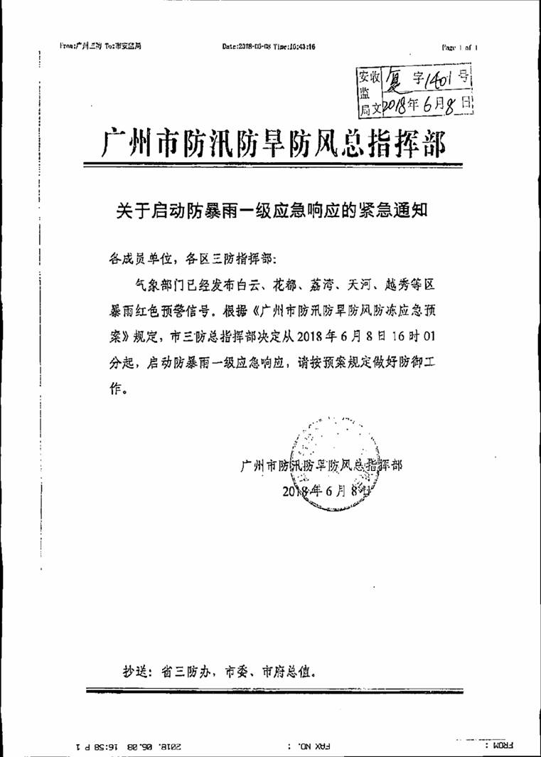轉發廣州市防汛防旱防風總指揮部關于啟動防暴雨一級應急響應的緊急通知