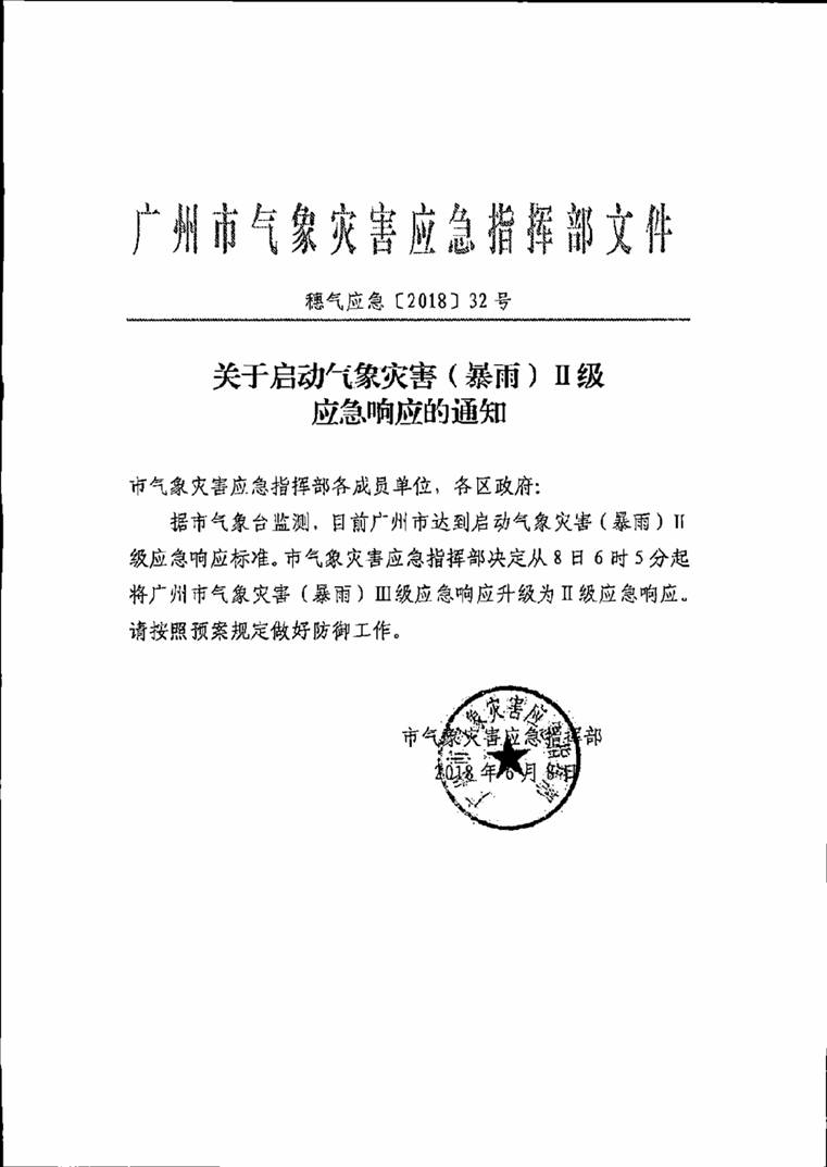 轉發廣州市氣象災害應急指揮部關于啟動氣象災害(暴雨)Ⅱ級應急響應的通知