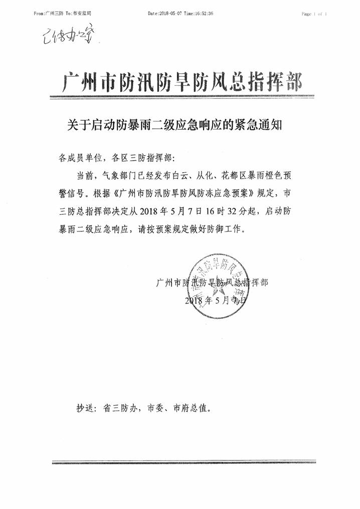 轉發廣東省防汛防旱防風總指揮部關于啟動防暴雨二級應急響應的緊急通知,請做好防御
