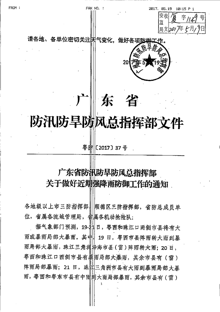 轉發廣東省防汛防旱防風總指揮部關于做好近期強降雨防御工作的通知