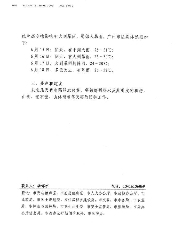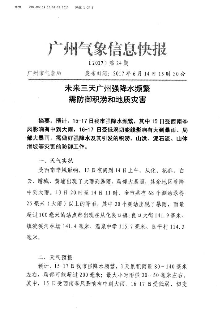 預計,15-17日我市強降水頻繁,其中15日受西南季風影響有中到大雨,16-17日受低渦切變線影響有大到暴雨、局部大暴雨。需做好強降水及其引發的積澇、山洪、泥石流、山體滑坡等災害的防御工作。