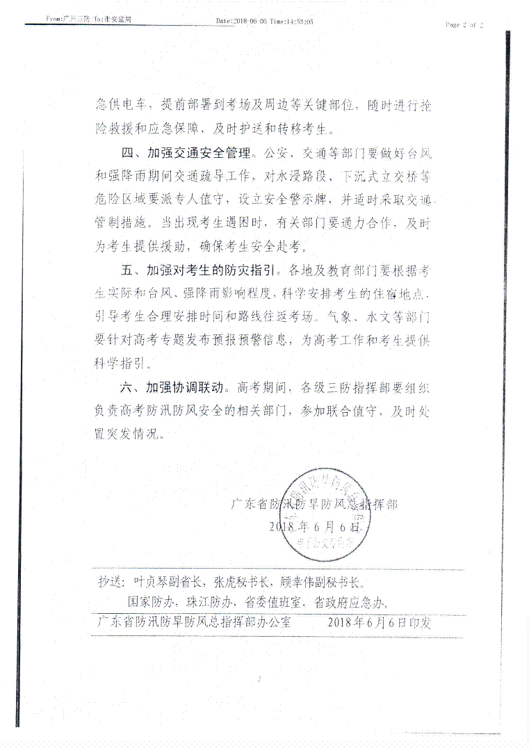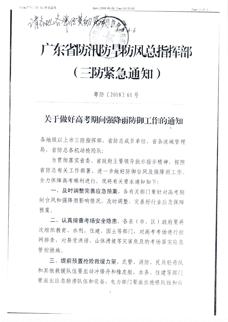 轉發廣東省防汛防旱防風總指揮部關于做好高考期間強降雨防御工作的通知