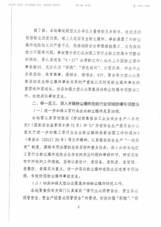 轉(zhuǎn)發(fā)廣東省安委辦關(guān)于做好工貿(mào)行業(yè)和大型公眾聚集活動(dòng)粉塵爆炸防范工作的通知