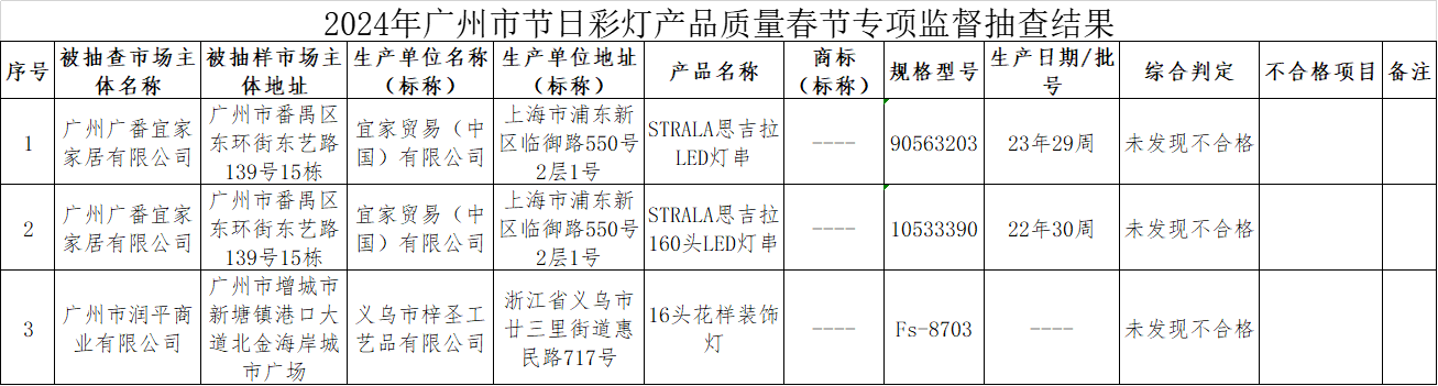 近日,廣州市市場監督管理局對節日彩燈產品質量進行了監督抽查,共抽查了3批次樣品,經檢驗,全部產品未發現不合格。