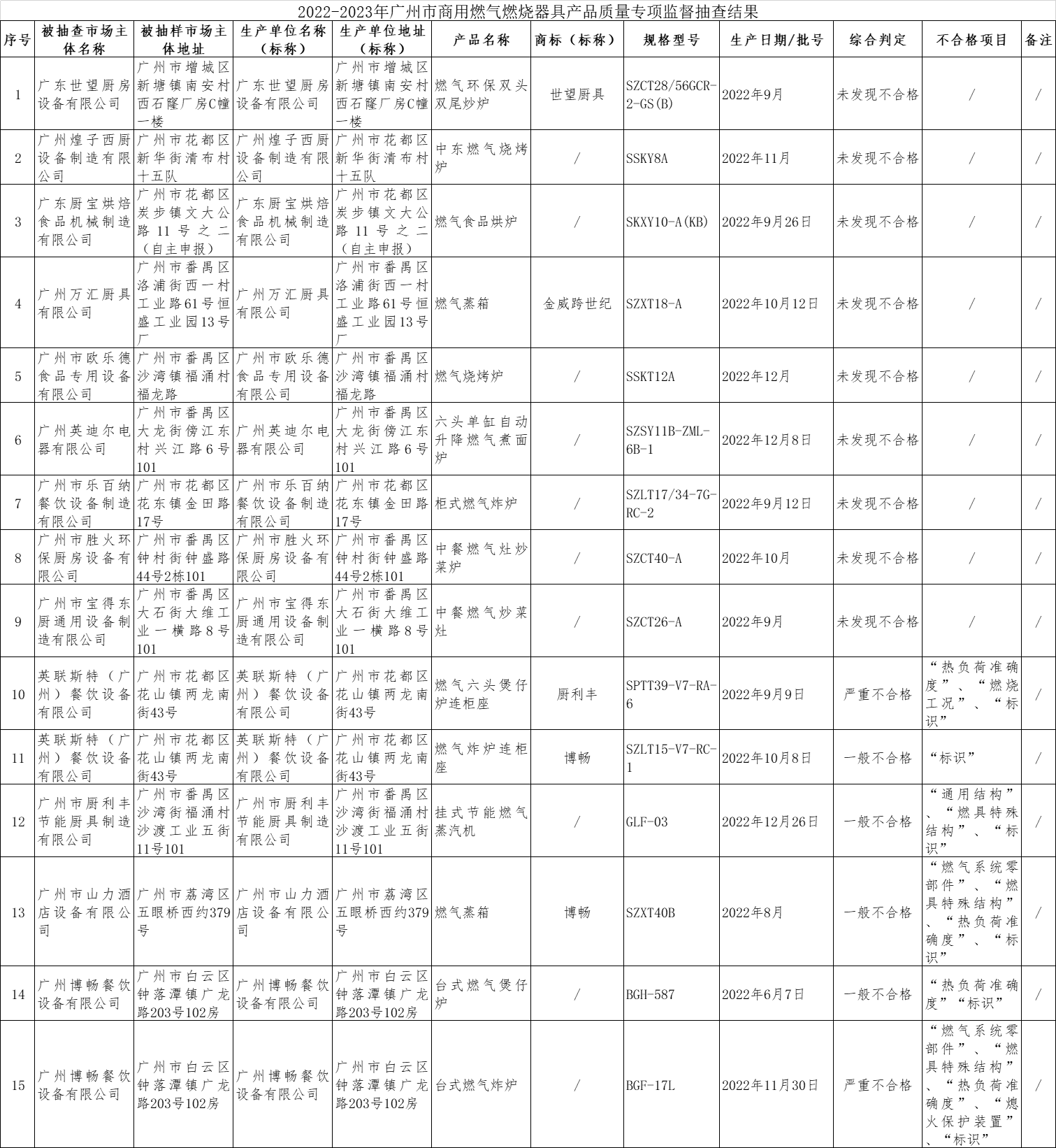 附件:2022-2023年廣州市商用燃氣燃燒器具產品質量專項監督抽查結果