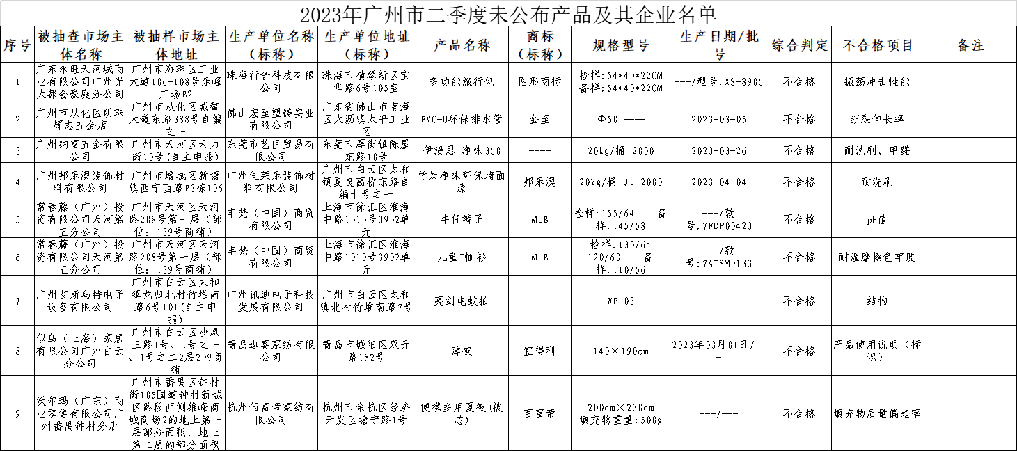 2023年第二季度廣州市共抽查動力鋰電池等產(chǎn)品,其中有9批次產(chǎn)品此前因產(chǎn)品處于公告送達(dá)期或異議復(fù)檢期暫未公告。