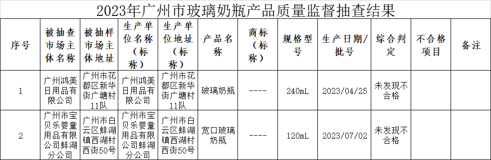 2023年第三季度,廣州市市場監督管理局對玻璃奶瓶產品質量進行了監督抽查,共抽查了2批次樣品,經檢驗,全部產品均符合標準要求。
