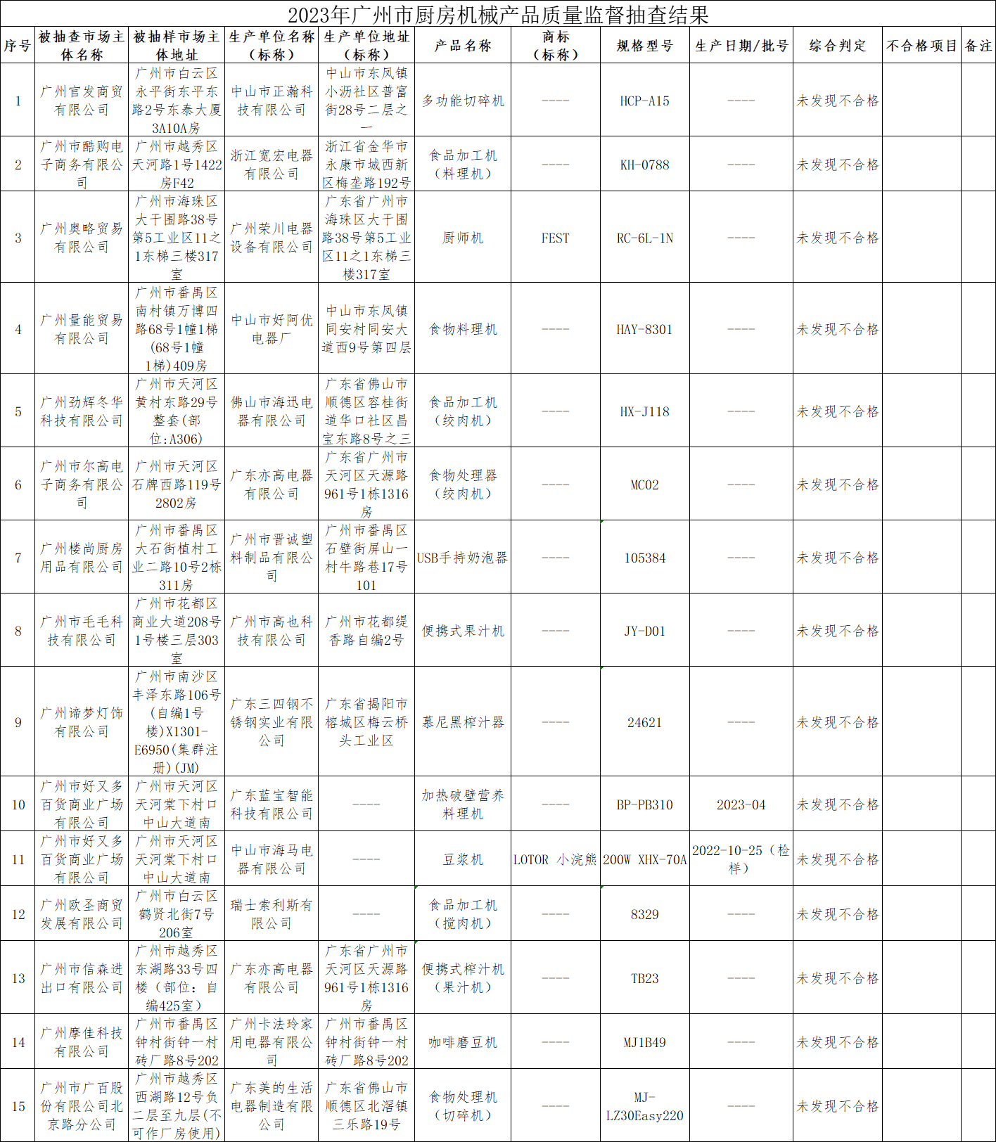 附件:2023年廣州市廚房機(jī)械產(chǎn)品質(zhì)量監(jiān)督抽查結(jié)果