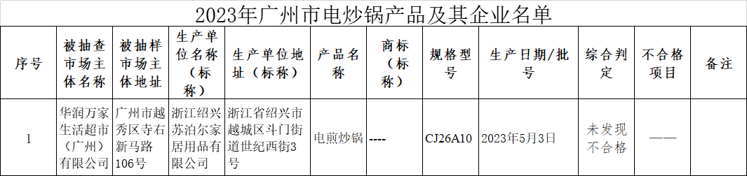 2023年第3季度,廣州市市場監督管理局對電炒鍋產品質量進行了監督抽查,共抽查了1批次樣品,經檢驗,本次監督抽查未發現不合格。