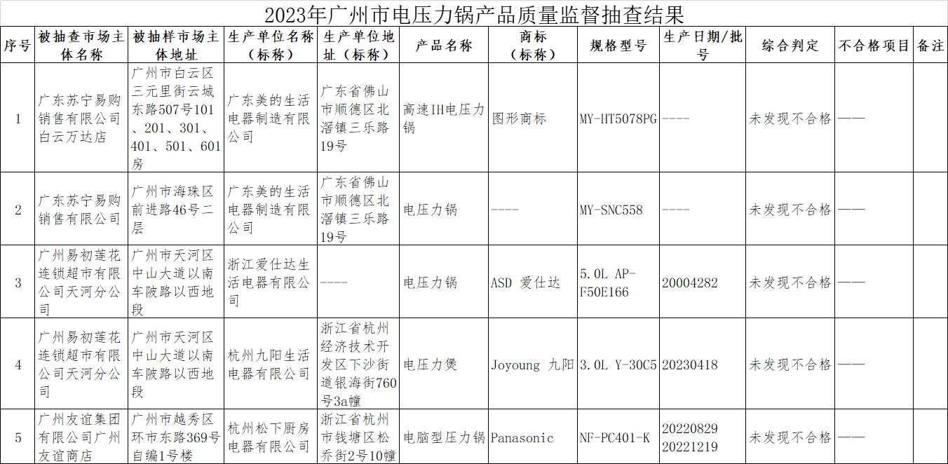 2023年第三季度,廣州市市場監督管理局對電壓力鍋產品質量進行了監督抽查,共抽查了5批次樣品,經檢驗,未發現不合格。