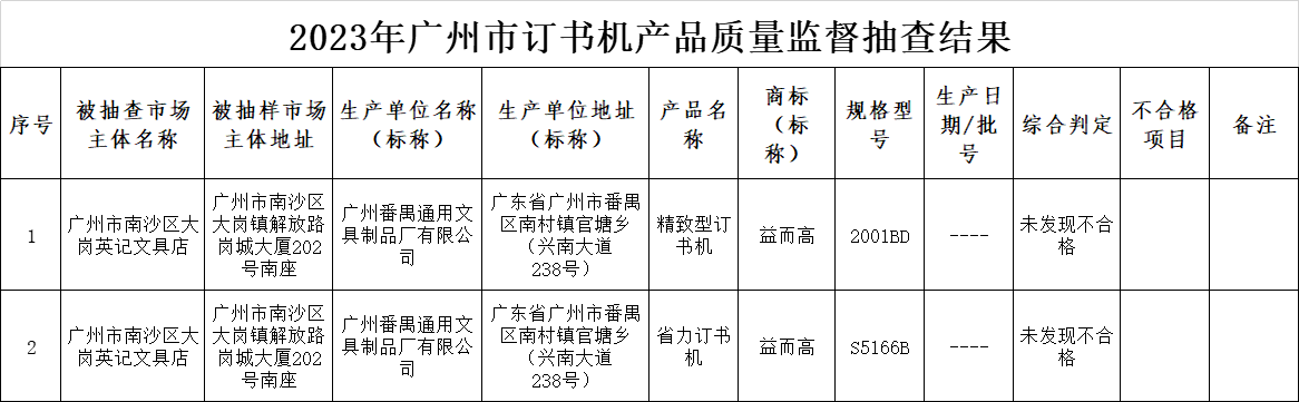 附件:2023年廣州市訂書機產品質量監督抽查結果