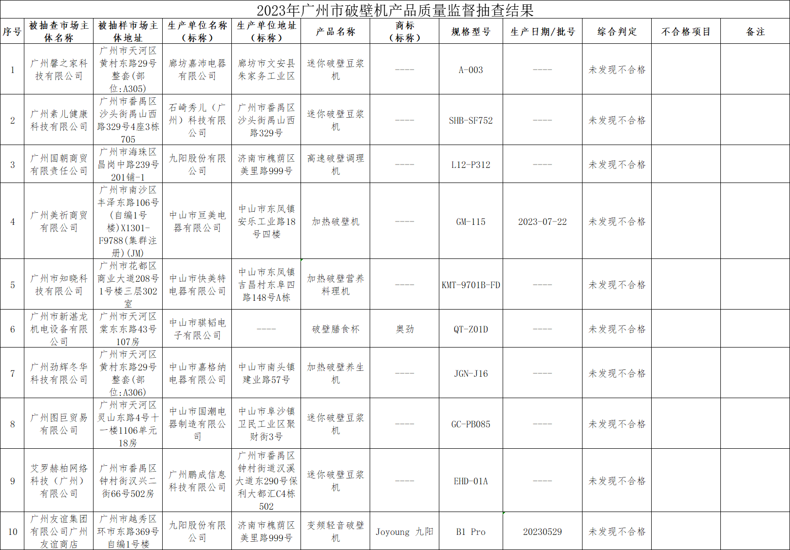 2023年第三季度,廣州市市場監督管理局對破壁機產品質量進行了監督抽查,共抽查了10批次樣品,經檢驗,未發現不合格。