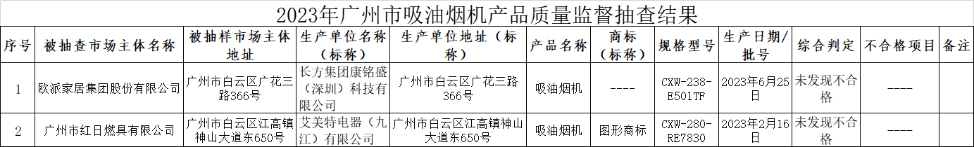 2023年第三季度,廣州市市場監督管理局對吸油煙機產品質量進行了監督抽查,共抽查了2批次樣品,經檢驗,全部產品未發現不合格。