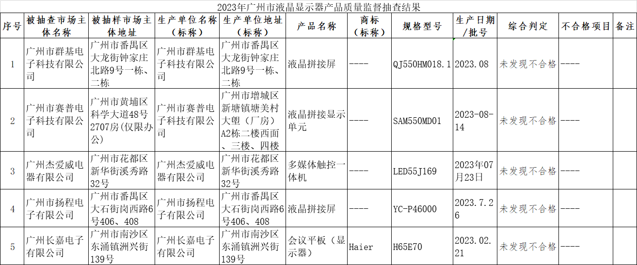 2023年第三季度,廣州市市場監督管理局對液晶顯示器產品質量進行了監督抽查,共抽查了5批次樣品,經檢驗,全部產品符合標準要求。