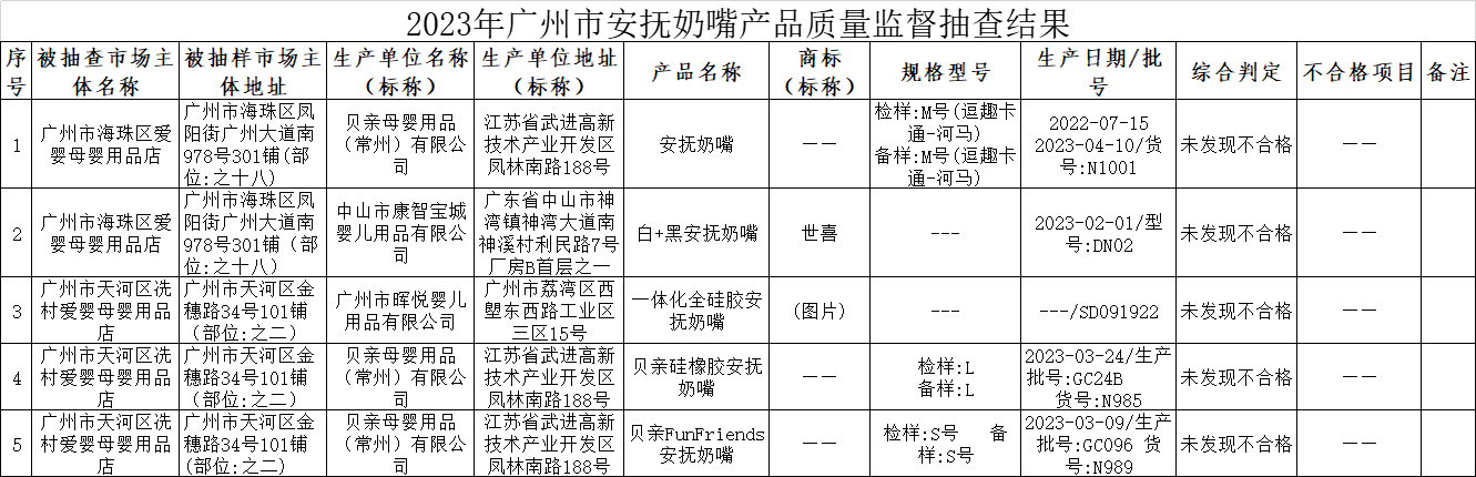 附件:2023年廣州市安撫奶嘴產品質量監督抽查結果 .png