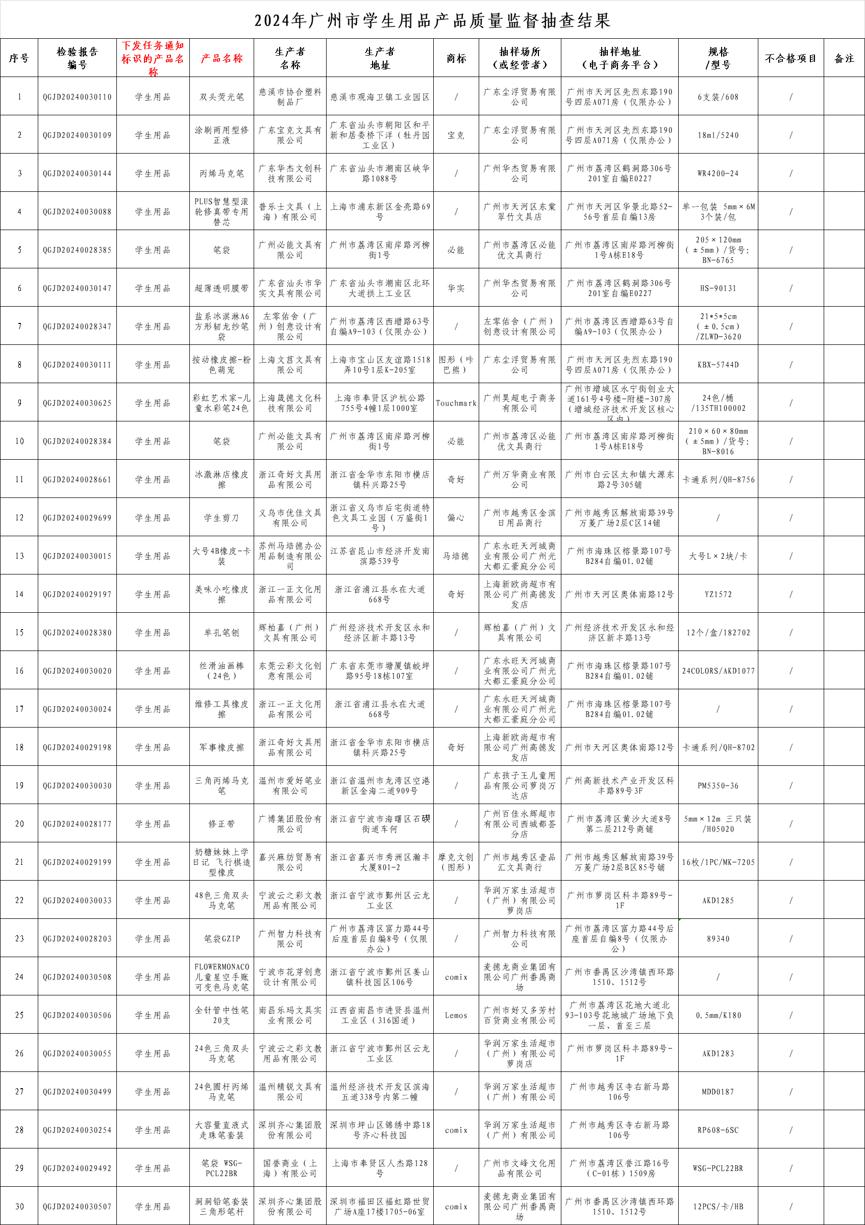 2024年第2季度,廣州市市場監督管理局對學生用品產品質量進行了監督抽查,依據法律法規及相關產品標準,經抽樣檢驗,本次未發現不合格產品。