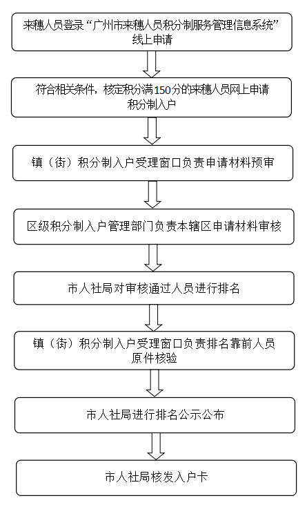 2025年度積分制入戶指標1.6萬個,申請積分制入戶人員應同時符合以下條件:(一)在廣州市合法穩定就業或創業;(二)年齡在45周歲以下,即1979年1月1日(含當天)后出生;(三)持廣州市辦理有效《廣東省居住證》;(四)繳納社會保險滿4年;(五)按照《廣州市積分制入戶指標體系及分值表》計算總積分滿150分;(六)近5年內未受過刑事處罰。