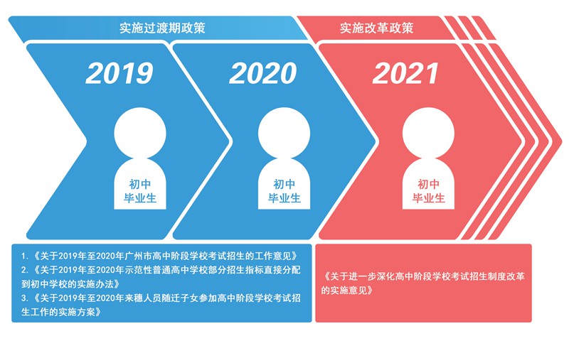 我市現行中考政策3份文件有效期將分別于2018年12月和2019年4月屆滿。根據省教育廳要求,作為試點市之一,廣州市須從2021年開始實施高中階段學??荚囌猩贫雀母铮母飳嵤┣暗?019年至2020年為過渡期。我市在現行中考政策3份文件的基礎上進行修訂,形成了過渡期政策3份文件,實施對象是2019年和2020年的初中畢業生;根據國家和省的要求,擬定了改革政策文件,實施對象是2021年至2023年的初中畢業生。經市人民政府常務會議審議、公開征求意見以及市法制辦審查同意,現予以印發。