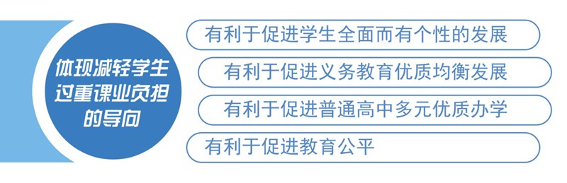 “一個導向+四個有利于”:體現減輕學生過重課業負擔的導向;有利于促進學生全面而有個性的發展;有利于促進義務教育優質均衡發展;有利于促進普通高中多元優質辦學;有利于促進教育公平。