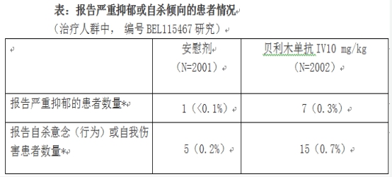 該項研究的1年期數(shù)據(jù)初步顯示,與標準治療加安慰劑治療的患者相比,標準治療加貝利木單抗治療患者報告更多的嚴重抑郁、自殺意念或行為及自我傷害(見表格)的不良事件(見下表)。