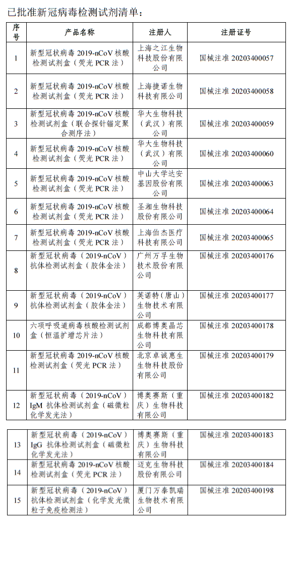 截至目前,國家藥品監(jiān)督管理局共批準新冠病毒核酸檢測試劑10個,抗體檢測試劑5個。