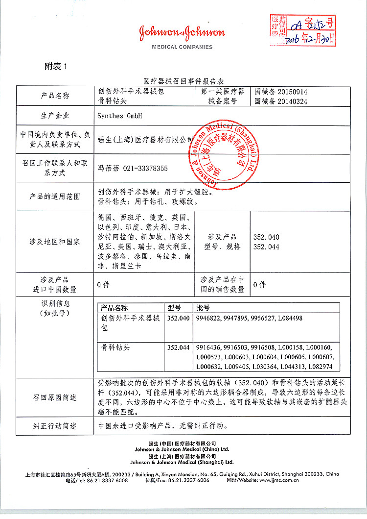 強生(上海)醫療器材有限公司報告,該公司代理的創傷外科手術器械包(備案號:國械備20150914)、骨科鉆頭(備案號:國械備20140324),發現受影響批次的創傷外科手術器械包的軟軸(352.040)和骨科鉆頭的活動延長桿(352.044),可能采用非對稱的六邊形耦合器制成,導致六邊形的每條邊長度不同,六邊形的中心不位于中心線上,這可能導致軟軸與其嵌套的擴髓器頭端不能匹配。其生產商SynthesGmbH對該產品進行主動召回,該公司稱本次召回產品未在中國銷售。請各省、自治區、直轄市食品藥品監督管理局加強對此類產品的監督管理。