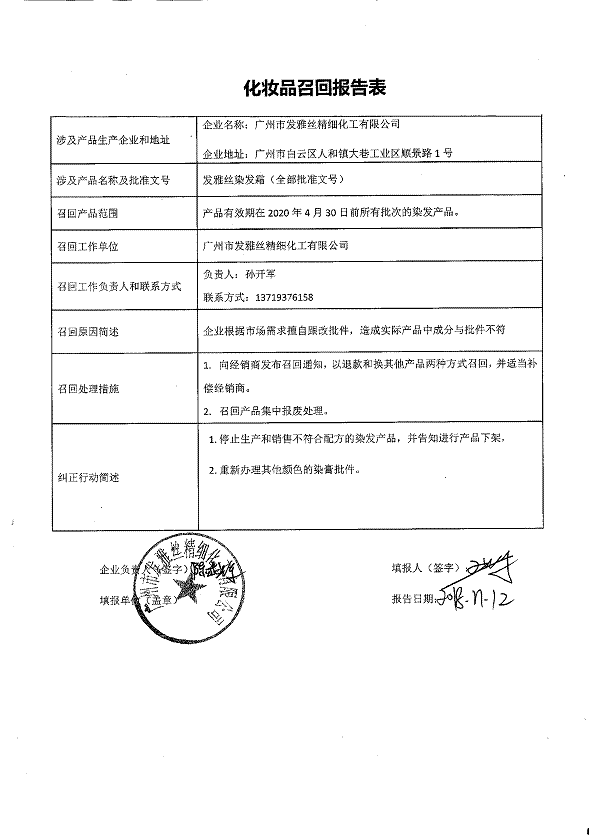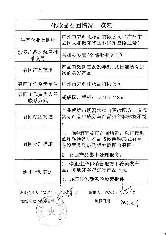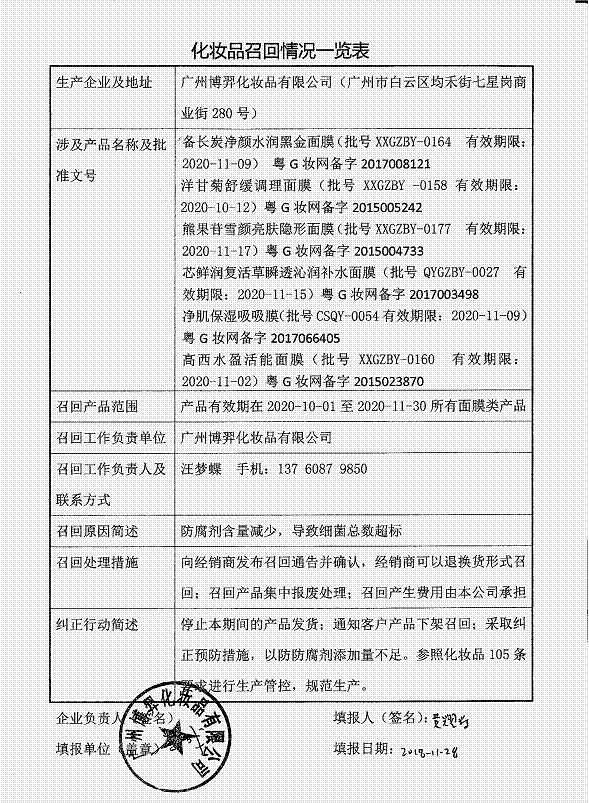 廣州市東輝化妝品有限公司、廣州市發雅絲精細化工有限公司、廣州博羿化妝品有限公司3家化妝品生產企業因生產不合格化妝品被原國家食品藥品監督管理局通報。上述企業已對不合格產品實施了主動召回,但仍有部分存在安全隱患的產品無法完成召回。經企業排查并報告我局,決定對存在安全隱患的產品實施全面召回。現將有關產品信息予以通告,具體內容詳見附件。