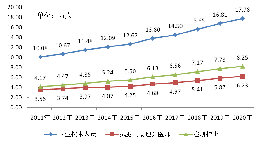 截止2020年底,全市醫療衛生機構在崗職工21.46萬人,其中:衛生技術人員17.78萬人、鄉村醫生和衛生員0.05萬人、管理人員0.96萬人、工勤技能人員1.90萬人、其他技術人員0.76萬人。衛生技術人員中,執業(助理)醫師6.23萬人,注冊護士8.25萬人,醫護比1:1.32。與上年相比,在崗職工增加1.19萬人,其中:執業(助理)醫師增加0.37萬人,注冊護士增加0.47萬人。