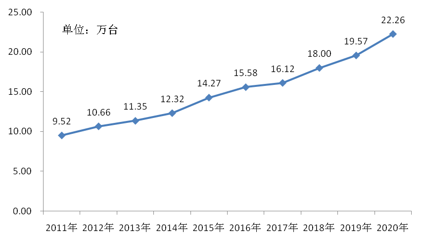 截止2020年底,全市醫療衛生機構擁有萬元以上設備臺數達22.26萬臺,比上年增加2.70萬臺,增長13.78%,其中:10-49萬設備4.51萬臺、50-99萬設備0.74萬臺、100萬及以上設備0.73萬臺。