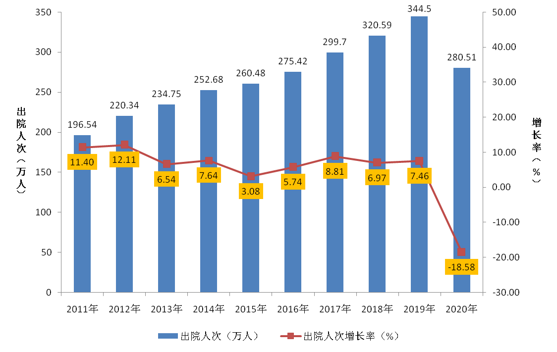 住院量:全市醫療機構出院人次為280.51萬人次,其中:醫院256.34萬人次,基層醫療衛生機構7.84萬人次,專業公共衛生機構16.33萬人次。與上年相比,全市醫療機構出院人次減少63.99萬人次,下降18.58%。