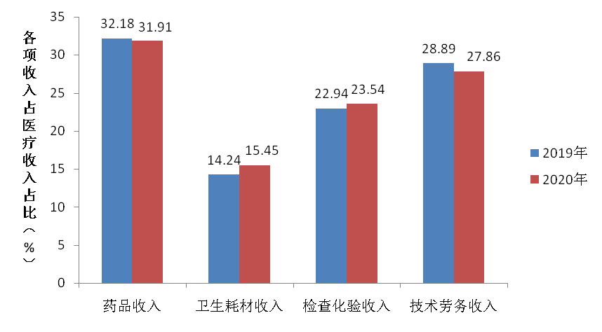 2020年,全市醫院醫療收入920.24億元,其中公立醫院醫療收入847.02億元,與上年相比,公立醫院醫療收入下降7.84%,其中藥品收入占31.91%、衛生耗材收入占15.45%、檢查化驗收入占23.54%、技術勞務(護理、手術、治療等)收入占27.86%。與2019年相比,藥占比下降0.27個百分點,衛生耗材占比提高1.21個百分點,檢查化驗占比提高0.60個百分點,技術性勞務占比下降1.03個百分點。