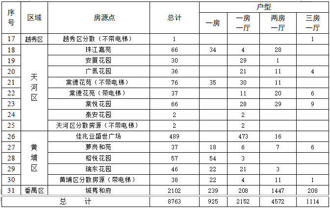 本次推出分配的公共租賃住房房源點共有31個,總套數為8763套,房源詳見公共租賃住房房源情況表。