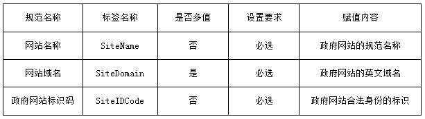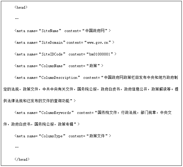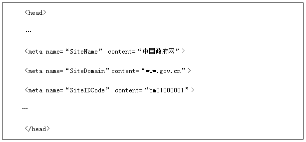 網頁標簽是指網頁模版中對有關展現內容進行標記而設置的標簽,通常包括網站標簽、欄目標簽、內容頁標簽等。政府網站要在頁面源代碼“〈head〉…〈/head〉”中以meta標簽的形式,對網站名稱、政府網站標識碼、欄目類別等關鍵要素進行標記,標簽值不能為空。